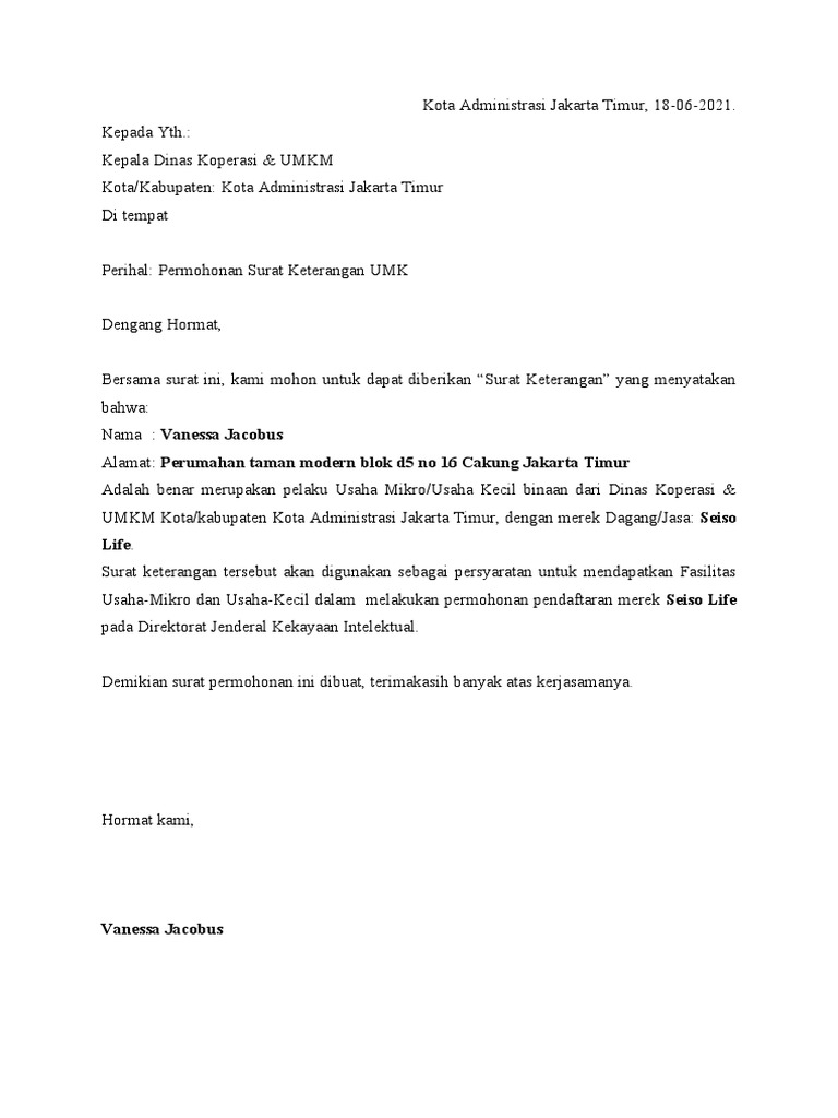 Draft Surat Permohonan Keterangan Umk Diajukan Ke Dinas Koperasi Umkm 18062021 07 12 48 Pdf